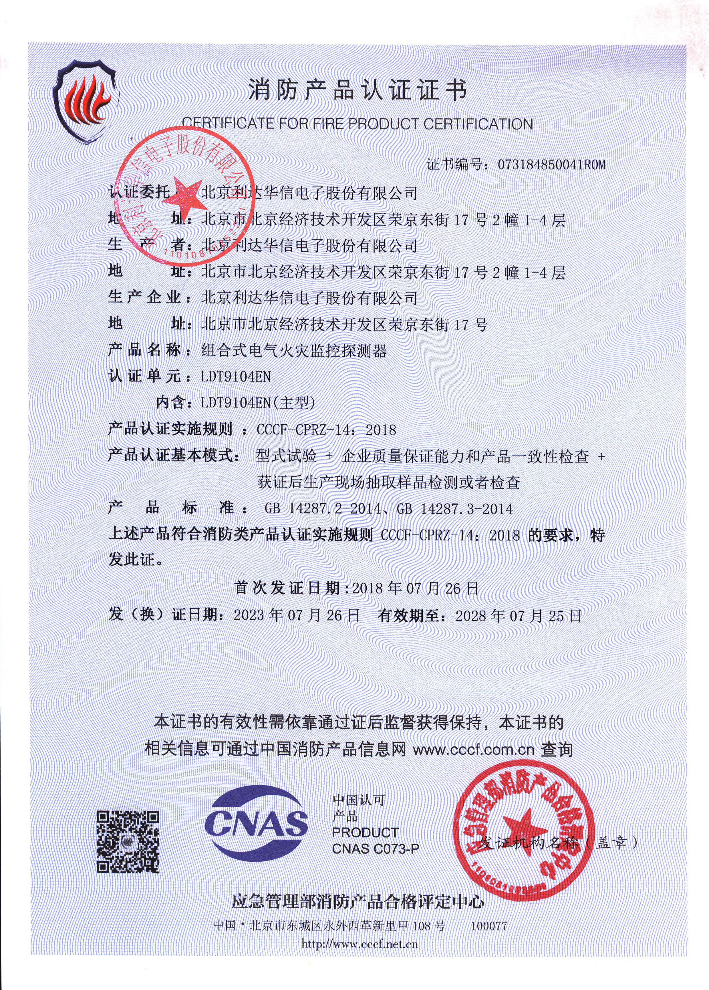 LDT9104EN 組合式電氣火災監控探測器 消防產品認證證書073184850041ROM(蓋公章).jpg